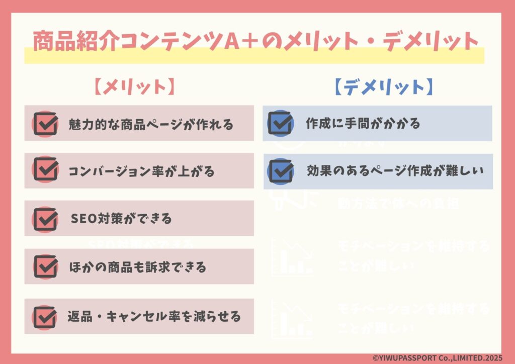 続いて、商品紹介コンテンツ(A+)を利用するメリットとデメリットをまとめました。ぜひ参考にしてみてください。