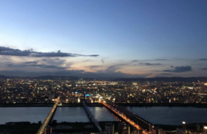 夜に、私たちは梅田スカイビルへ行きました、173メートルの展望台で大阪の夜景を見ました。大阪の夜景は杭州に似てると思います。