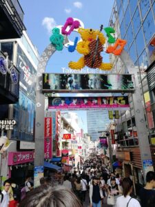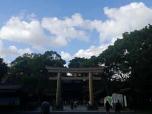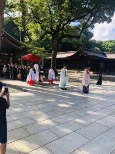 浅草の次は渋谷と原宿に行きました、原宿で昼ご飯を食べました後、竹下通りを歩きました。竹下通りは若者の街として、洋服屋や喫茶店などが多かったです。その日の天気は非常に暑かったので、友達が明治神宮に行こうと提案しました。私達は南参道から入って、道の両側に巨大な木がありますので、森に入ったような気がして、あっという間に涼しくなりました。そして、本殿に着いた後、結婚式を行っている人がいるのを偶然見ました。超ラッキーでした!