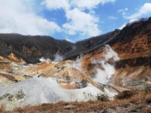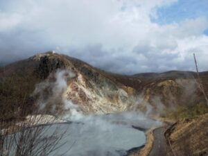 三日目は登别地狱谷へ行きました。登別の駅は古い感じでエレベーターもエスカレーターもなし、そして小さな駅です。駅の古いと反対にして、温泉町は立派な温泉ホテルいっぱいです。地狱谷の風景を満喫したあと 范さんと露天風呂にも体験しました。風景を見ながら 風呂したりすることは最高です。
