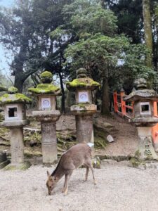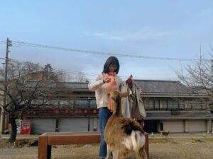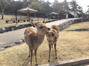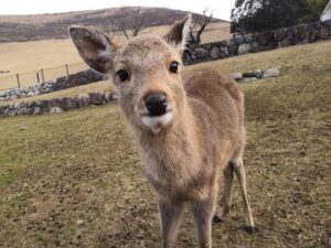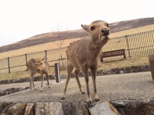 せんべいをもらうように、鹿ちゃんはお辞儀しながら人に向いてきます。その時はせんべいを与えないと倒れられますよ。お尻にも蹴られるかもしれません(笑)。でも、何にも持っていない場合は手を挙げて鹿に見せてもらえれば無事ですね。