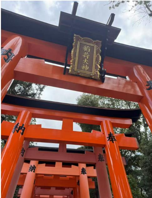 初日の午前、有名な伏見稲荷大社へ行きました。赤い鳥居が続く「千本鳥居」はとても神秘的で、山道を登ると京都の街並みが一望でき、素晴らしい景色を楽しめました。